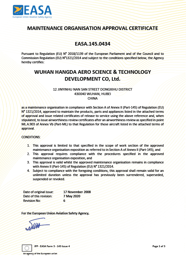 2020年5月 徑河廠區(qū)獲得EASA維修許可。